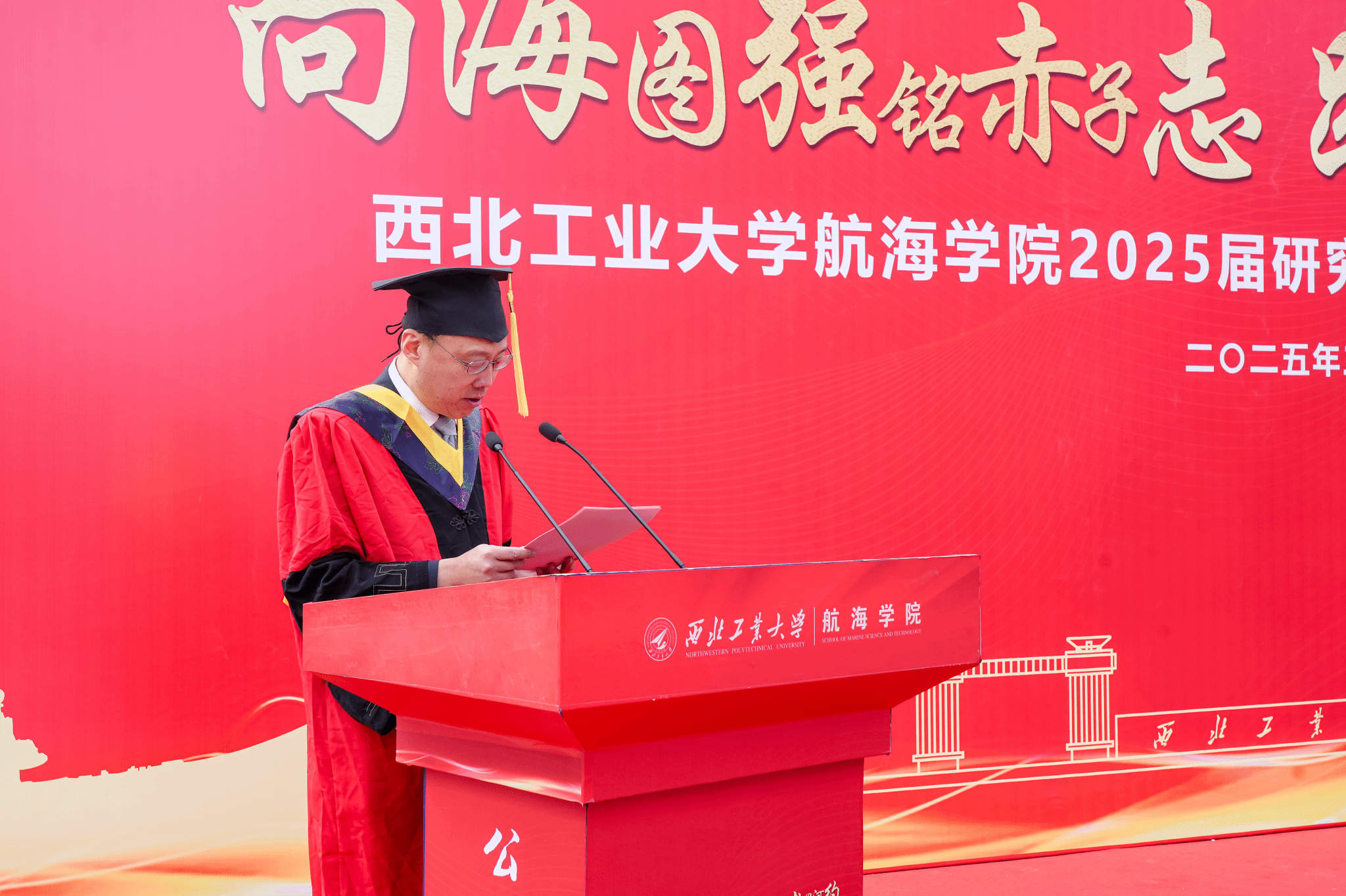 典礼第二项,潘光院长发表致辞,寄语毕业生们,“在技术变革中保持定力”“在数字洪流中守护人性温度”“在全球化浪潮中深化协同创新”,激励毕业生们,“以科技为楫,以理想为帆,此去经年,乘风破浪,在建设海洋强国的壮阔航程中,在中华民族伟大复兴的蓝色征程上,奏响属于西工大航海人的时代强音!”