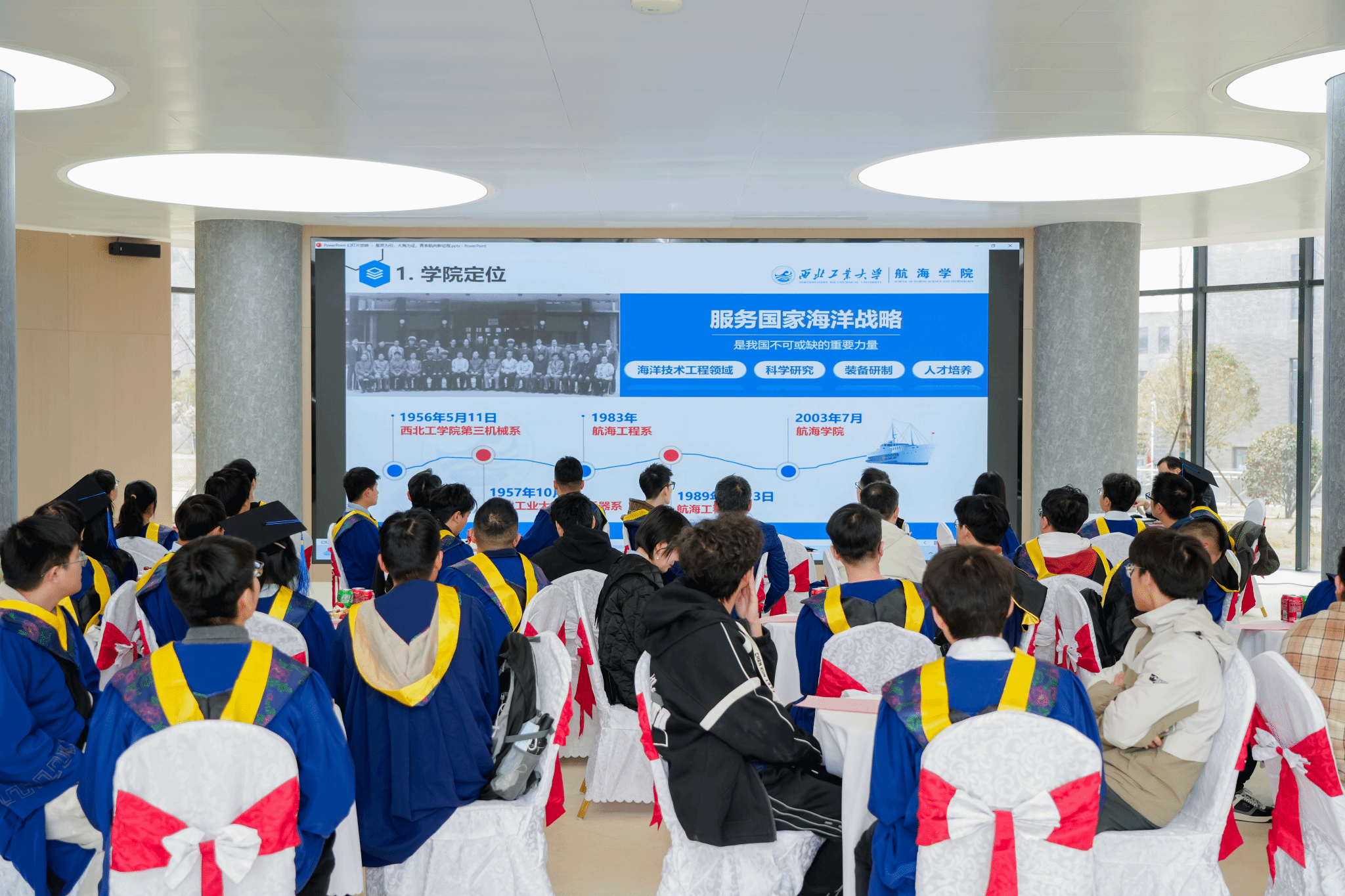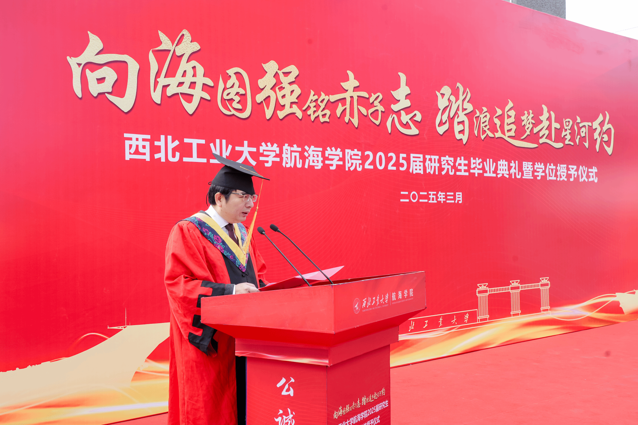 典礼第二项,潘光院长发表致辞,寄语毕业生们,“在技术变革中保持定力”“在数字洪流中守护人性温度”“在全球化浪潮中深化协同创新”,激励毕业生们,“以科技为楫,以理想为帆,此去经年,乘风破浪,在建设海洋强国的壮阔航程中,在中华民族伟大复兴的蓝色征程上,奏响属于西工大航海人的时代强音!”