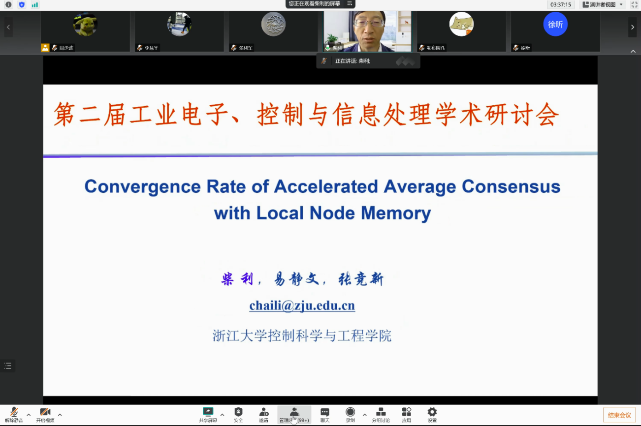 随后,来自工业电子、控制和信息处理领域的知名专家为大会奉献了6场精彩的报告。施阳教授作题为《Self-Triggered Adaptive Model Predictive Control for Constrained Nonlinear Systems》报告,李少远教授作题为《复杂生产条件下流程工业系统操作优化与预测控制》报告,陈景东教授作题为《麦克风阵列设计与处理方法及其在极端环境中的应用》报告,徐昕教授作题为《基于学习的非线性预测控制及应用》报告,柴利教授作题为《Convergence Rate of Accelerated Average Consensus with Local Node Memory》报告,喻俊志教授作题为《水下机器人视觉感知与智能运动控制》报告。