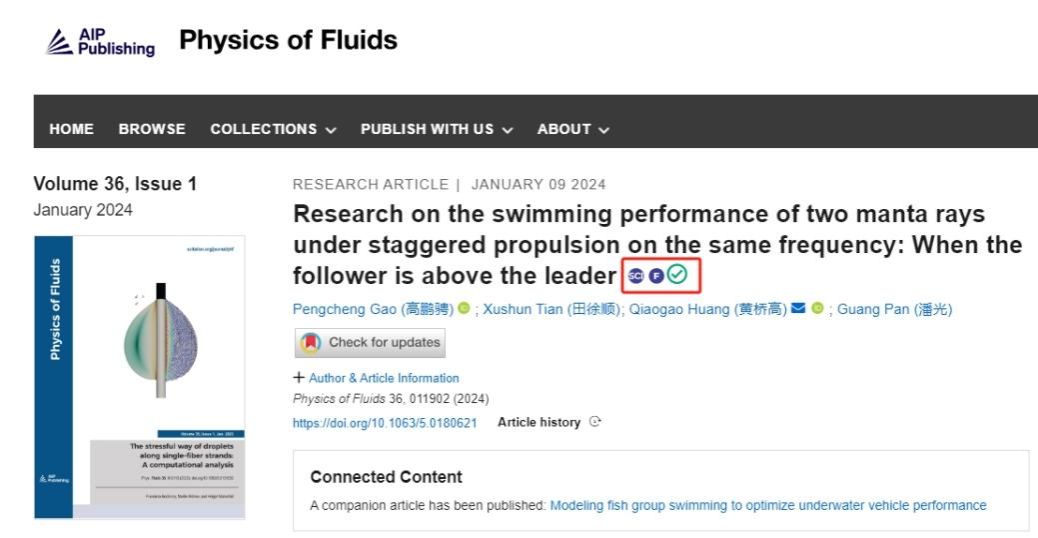 潘光教授团队发表题为“Research on the swimming performance of two manta rays under staggered propulsion on the same frequency: when the follower is above the leader”的研究论文。该研究成果被国际流体力学知名期刊《Physics of Fluids》作为主编推荐特色文章(Featured Articles)发表(图一),并被美国物理学联合会“科学之光”(Scilight)专题文章采访报道(图二)。JavBus