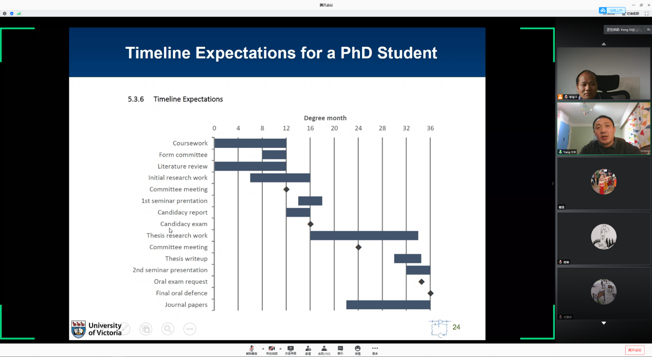 在具体介绍中,施阳老师提供了关于硕士生和博士生研究时间规划的一些指导。在每一个时间节点均有一个期望值,在第一年主要完成课程学习以及文献综述,为之后的研究打下一个良好的基础。后面的时间开展具体的有框架的论文研究工作,同时包括写作、发表论文、成果汇报等等工作。