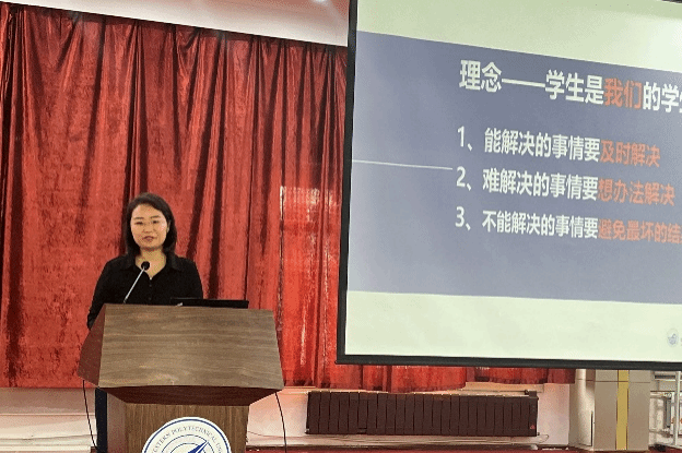 随后,开展学生工作业务的培训交流。校优秀辅导员杜鹏从辅导员工作期间的自身经验出发,对学生工作的主要内容和涉及部门进行了详细介绍,并向各位老师分享了学生工作的特点及突发情况的处理经验;校优秀班主任杨占龙按时间节点分析了班主任各阶段应重视的工作,时刻关注学生情况,帮助学生尽早规划道路;校优秀辅导员张晓燕分享了担任辅导员和班主任期间的工作经历,坚持以学生为根,从学生角度出发,切实为学生提供帮助。