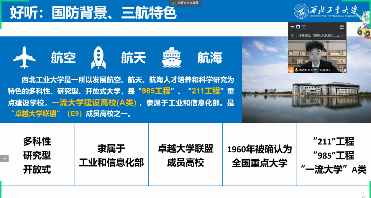 DL022304班的15位同学在班主任赵政桥老师的指导下,由班长庞景文带队,于2024年1月面向生源地的高中生和家长开展了“带工大返母校”寒假线上集中社会实践活动。活动中同学们积极挖掘西工大人扎根奉献、报效祖国的故事,探寻总师育人文化的传承与实践,并成功向高中母校的目标学生和家长进行了线上招生宣传活动。