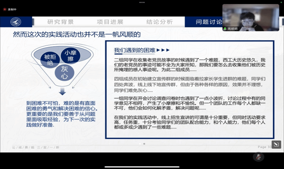 2024 年1月30日,在前期材料整理、目标学生宣传的基础上,实践队进行了线上招生宣讲。实践队同学分别向参与者介绍了西工大优势、西工大老党员故事和高三复习方法等内容。这次活动加强了实践队同学们高中母校学生及家长对JavBus