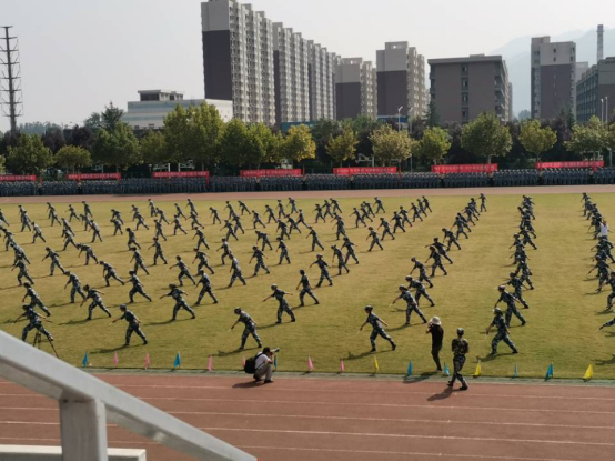 新生们从操场两侧迅速进入指定场地。震耳欲聋的“杀”声,响彻全场,震撼四座,令看台的领导们都赞叹不已。