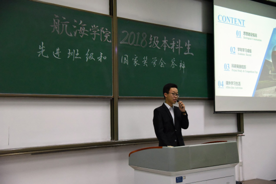 本次奖学金答辩会分为三个环节,答辩选手通过PPT、视频、现场解说等方式向大家展示自己出彩的科研竞赛经历和优异的学习成绩等;在选手介绍完毕后,由台下评委提问,选手一一回答在场评委的问题;最后,统计计分,答辩完毕。