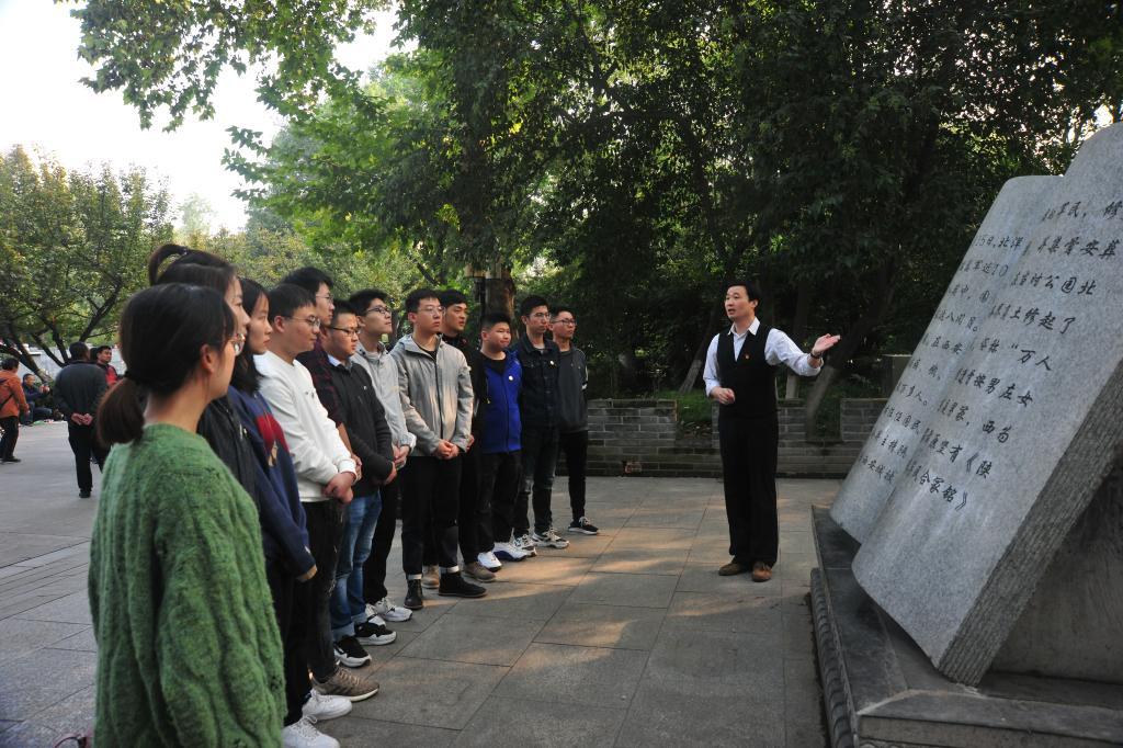 辅导员庆老师与同学们时而围坐在一起畅谈所感所得,时而伫立在杨虎城将题写挽联前凝神细思。师生们深受鼓舞之余,齐唱《英雄赞歌》、同颂纪念碑文,将教育活动推向高潮。