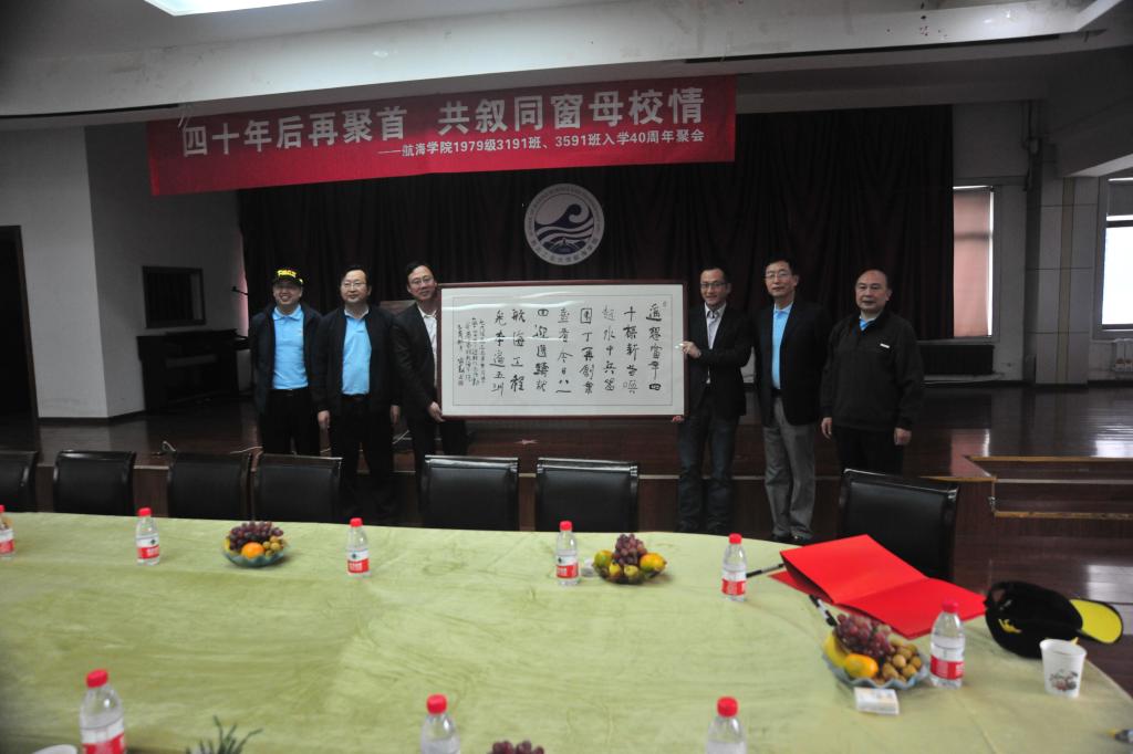 赠送书法匾额,其上写着“遥想当年四十棵新苗唤超水中兵器,园丁再创业;还看今日八一四迎送铸就航海工程,桃李遍五洲”,以表示同学们对JavBus