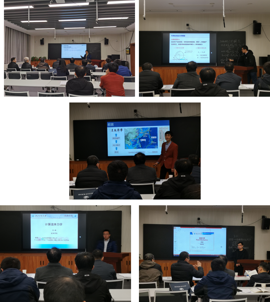 随后,五位青年教师黄潇、陈依民、郭志巍、任峰、谢络分别讲述船舶阻力、自动驾驶导论、振动与噪声控制技术、计算流体力学、流体力学课程中的抽选章节。