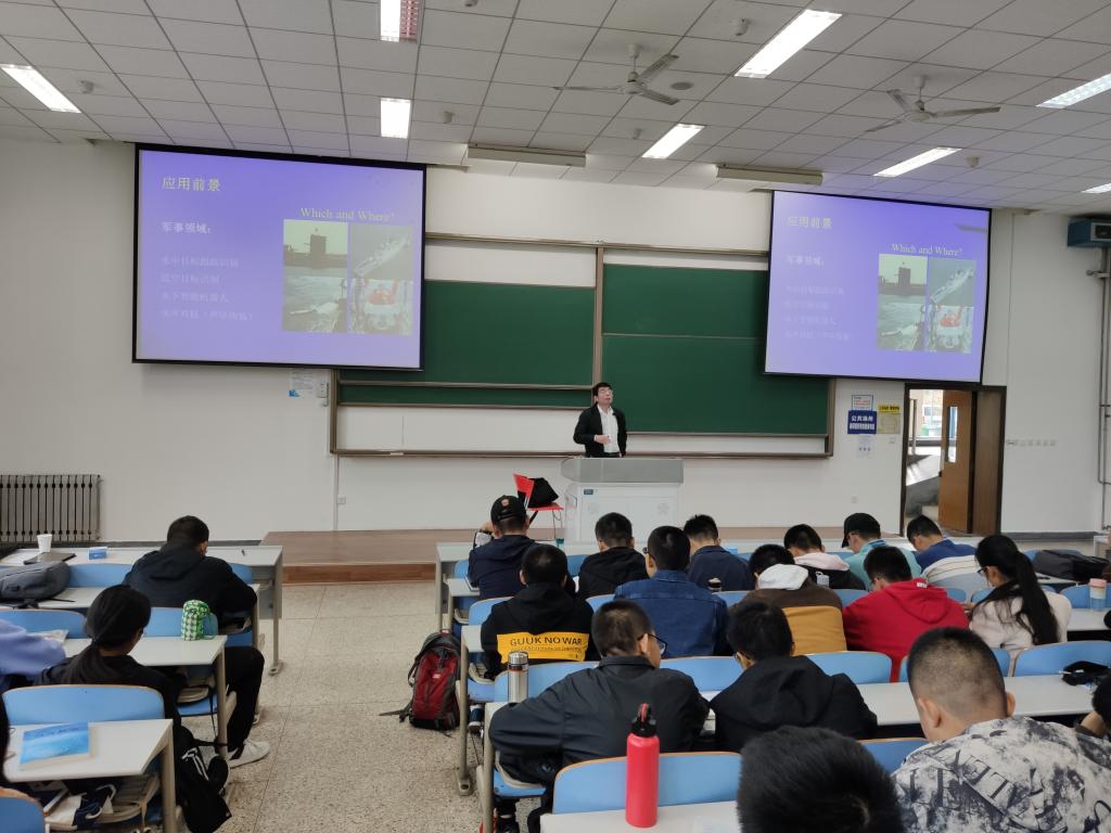随后,曾老师基于多年的研究基础,重点介绍了水声信息对抗领域的一项瓶颈技术——水中目标自动识别技术。他首先介绍了水中目标识别在水声探测与对抗领域的重要地位,以及该技术在国防和民用领域的应用前景。然后,他从军事需求、基本原理、重要技术环节实现、国内外发展现状和趋势等方面进行了生动、详细的阐述,让同学们对这项紧密融合水声学、信号处理和人工智能的技术方向有了较全面的了解。
