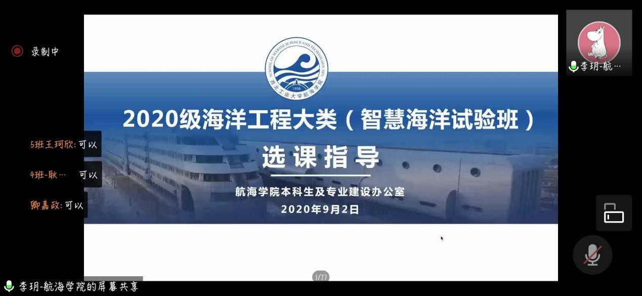 本科教学副院长曾向阳、教学办李玥、李海燕老师、辅导员崔晓东、及各班班主任与200余名学生、学生助理一起参加了选课指导在线会议。曾向阳副院长首先发言,简要介绍了海洋工程大类课程体系和培养特色,并针对选课提出了几个方面的要求和注意事项。然后由李玥老师就选课基本政策、海洋工程大类培养方案、选课基本原则、体育与健康及语言类方案解读、建议修读课程五个方面进行了详细讲解和指导。