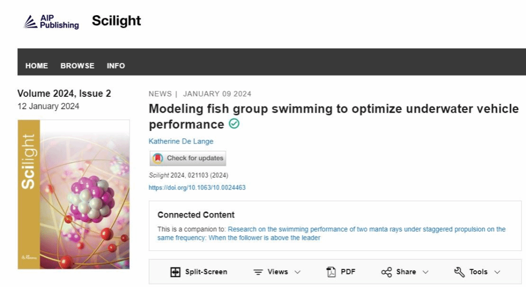 潘光教授团队发表题为“Research on the swimming performance of two manta rays under staggered propulsion on the same frequency: when the follower is above the leader”的研究论文。该研究成果被国际流体力学知名期刊《Physics of Fluids》作为主编推荐特色文章(Featured Articles)发表(图一),并被美国物理学联合会“科学之光”(Scilight)专题文章采访报道(图二)。JavBus