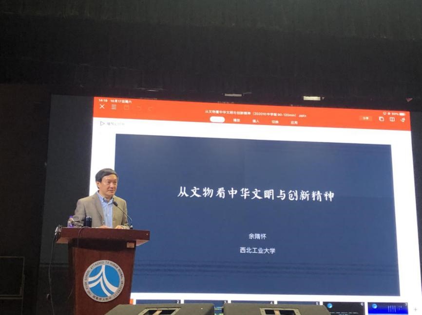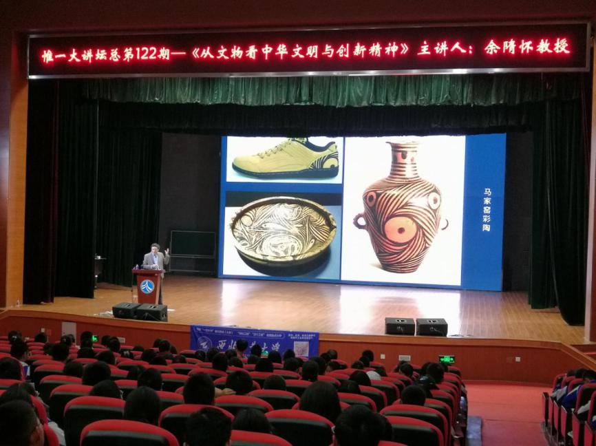 余隋怀教授做客湖南师大附中惟一大讲坛,为全体高一学生做了题为《从文物看中华文明和创新精神》的讲座。余老师带领潇湘学子穿越中华千年文明,从文物中品味中华文化盛宴。从仰韶时期马家窑彩陶的奇妙漩涡,到殷商、西周时期甲骨文、金文的“师法自然”,再到四合院等古代建筑的“天人合一”;从秦代制与器的威严、强盛,到汉代造物的“以人为本”,再到盛唐的开放与繁荣,余教授带领大家在中华历史的长河中穿梭,用大量的史料与文物展示了中华文明与器物的瑰丽与震撼。五星出东方,为开来而继往。“我们比历史上任何一个时期都更接近中华民族的伟大复兴。”余隋怀勉励学子勇接时代火炬,在批判中继承,在继承中发展,尽己之力点燃文化之火,肩负起时代使命,做有素质、会创新、傲立于世界文化之巅的新青年。“只有唤醒古老中国蕴藏的能量,在现代语境下复苏,才能带动起整个东方文明。我们要呈现于世的不是甜品,而是盛宴。”