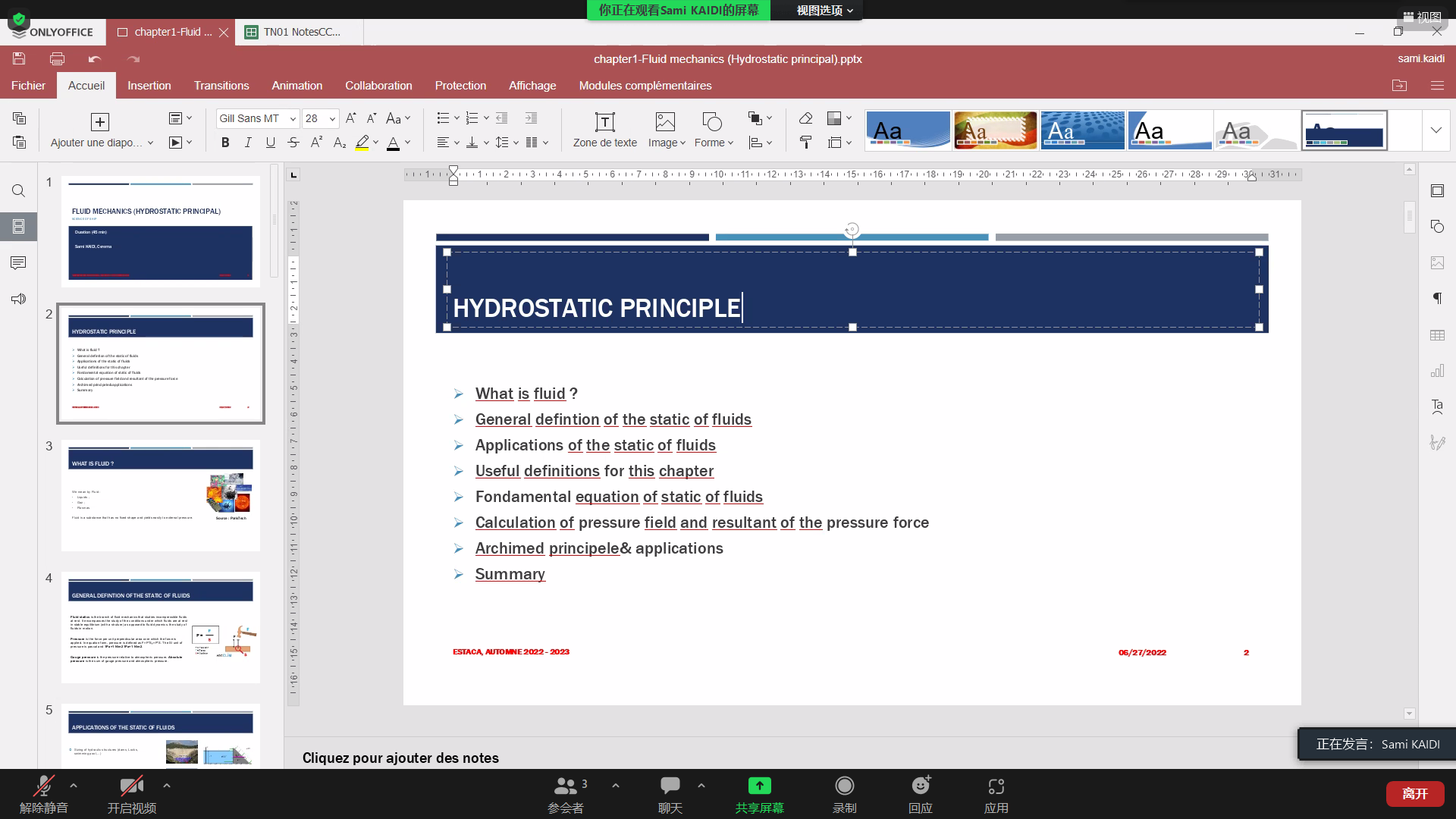 Sami Kaidi老师在第一节课介绍了一些流体力学的基础概念,并通过课堂练习巩固当天的内容。