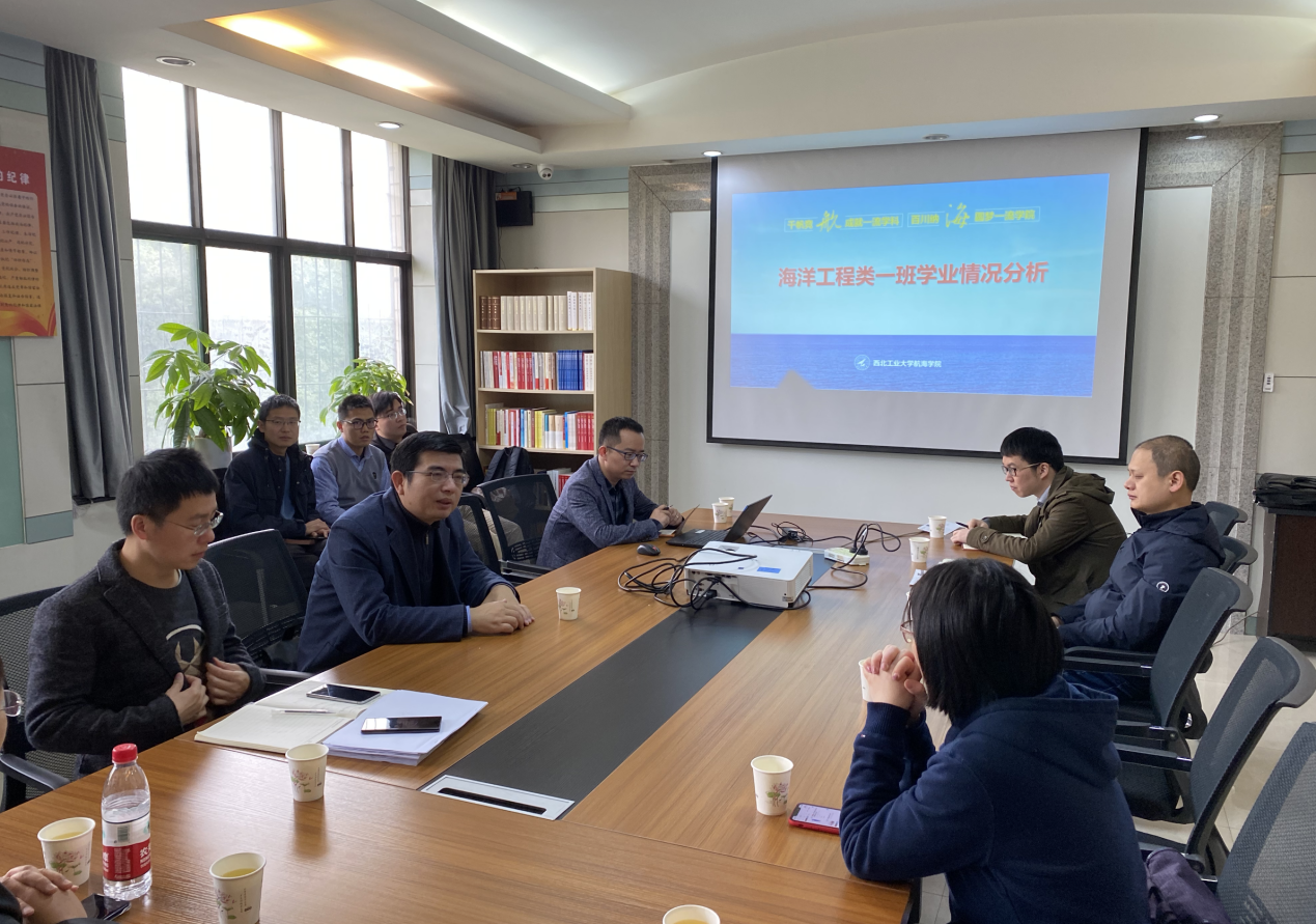院长潘光,党委书记孙华强,副院长曾向阳,海洋工程大类本科生2019级辅导员李书磊与2020级辅导员崔晓东,和各级班主任老师参加了会议。会议由曾向阳主持。