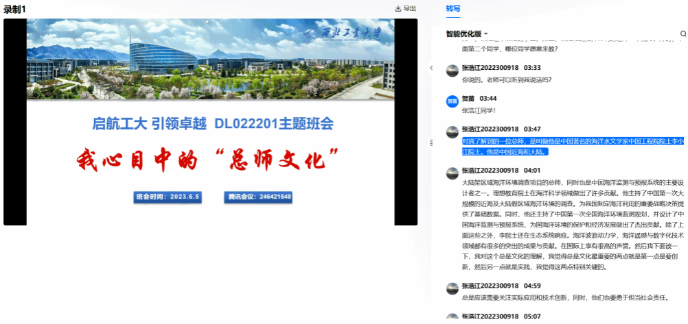 随后班上各位同学也就总师文化、人才培养等方面提出了自己的看法,大家在交流中不断树立起自己对于总师文化的理解,并立志要向总师看齐,以高标准要求自己,力求成为祖国的高级人才乃至国家的栋梁。
