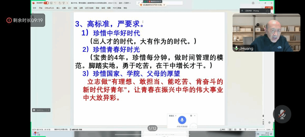 的发展历程。此外,黄老师从立大志成大才、怎么学怎么干,以及高标准严要求三个方面,对新生们进行了深入而细致的劝诫与指导。他言辞恳切,寓意深远,为新生们的大学生活和未来发展指明了方向。
