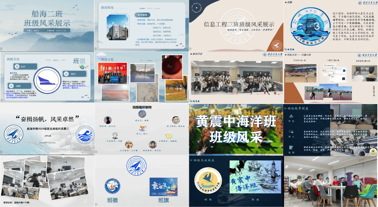 各班班长通过PPT、视频、现场表演等形式展示了班级建设情况,介绍了自己班级的组织架构、班级规章制度、班徽、班旗、班级口号和破冰活动等开展情况以及班级未来发展规划。各班的展示都充满创意,场下的同学们赞叹不断。
