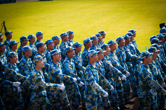 在云天苑操场上,新生们准备接受校领导和师长的检阅。威武的解放军进行曲结束后,汇演正式开始,每一位同学都拿出了最好的精神风貌迎接检阅。