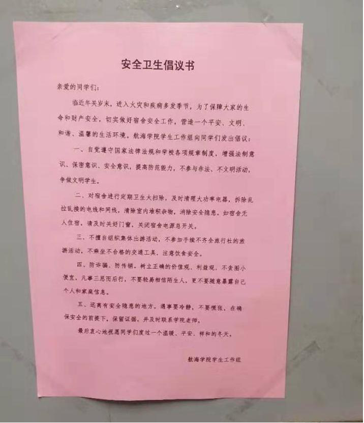研究生会在2019级新生中开展“校园宿舍安全倡议书”发放及安全知识普及活动,本次活动的主题为“宿舍是我家、依靠你我他”。在研会的大力倡导下,2019级秋季入学研究生分为2个博士生班,9个硕士生班,分别利用系会议室、教研室和宿舍召开安全教育主题班会,学习包含宿舍安全在内的交通安全、食品安全、人身财产安全、预防校园贷、网络电话诈骗、传销等方面的安全知识,讨论制定班级安全公约,设立宿舍安全员,做好活动小结。同时研会的同学积极引导新生在各自宿舍的醒目位置,张贴《宿舍安全卫生倡议书》,倡导在宿舍内规范行为、文明生活,禁止在宿舍内私拉乱扯电线、使用大功率电器、抽烟饮酒、饲养宠物等行为。此次活动的开展,有利于引导同学们明确安全责任,培养安全意识,使每一个人都自觉行动起来,共同维护安全、文明、和谐的宿舍环境。