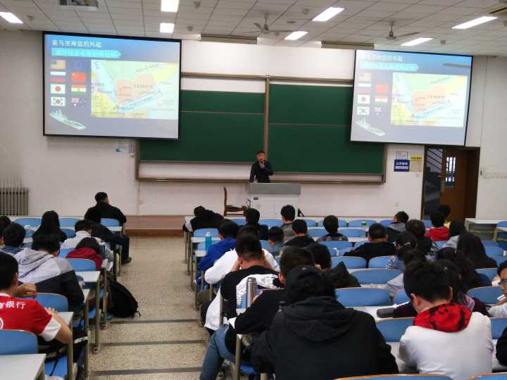 张岩老师在教西D102为中级党校的同学们带来了一场别开生面的党课。张岩老师从自己参与护航及一系列海上行动出发,结合自己的个人经历和心得体会,生动地向同学们讲述了世界海上形式的状况。当今世界并不太平,海洋也充满了危险和挑战,张老师在服役期间曾多次随中国军舰外海执行任务,参与撤侨等一系列海上维和行动。蔚蓝的海洋有着极为丰富的资源,却也有重重危险,同样存在国家间的利益争端,我国的地缘环境形势不容乐观,海上邻国多,与多国存在岛屿领土争议,所以,对于海洋、海军的建设,我们决不能落后!