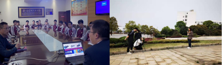 图4 在株洲南方中学与高三学生座谈 图5 608所校友录制视频