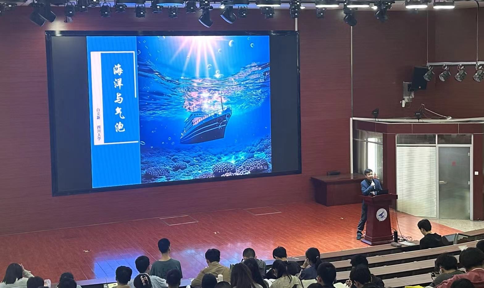 白立新老师从海洋中的自然现象讲起,先言海洋中气泡无处不在,以引起同学们的兴趣。在微观角度白立新老师见微知著,通过讲授螳螂虾如何通过气泡捕获猎物,高压气枪气泡这一深海勘探的核心难题体现了气泡在自然界中的广泛存在,在宏观角度上又从先进制造、环境与化工、医学和生命科学等诸多领域入手,让学生了解到气泡的重要价值。
