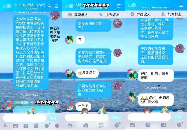 (二)坚持结果导向,想师生所想 在封控前期,一些学生因拿不到材料焦虑不安。研究生教学办工作人员耐心地给学生做思想疏导,也承诺会竭尽所能保证学生论文返回时间,不影响大家毕业。全心全意做好学生心理疏导,让学生安心、放心。
